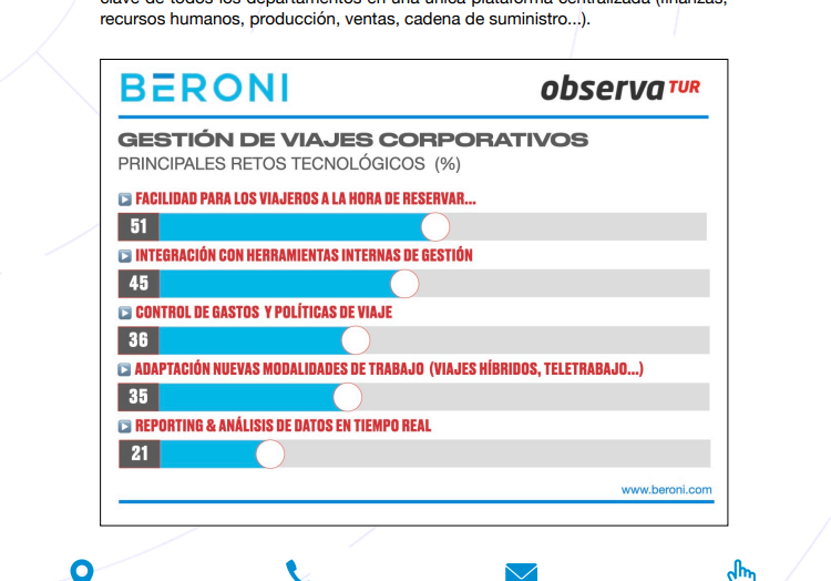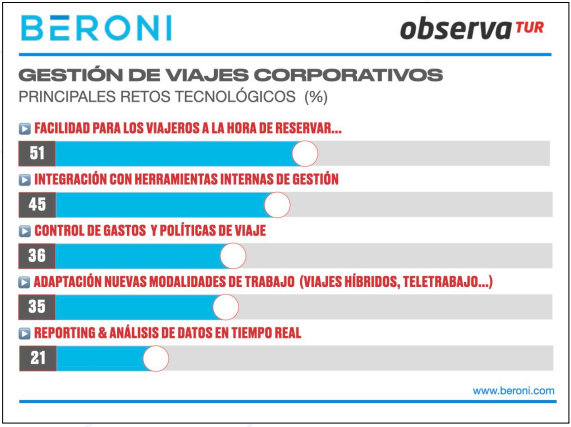 Según Josep Bellés, CEO de Beroni, “el estudio llevado a cabo por Beroni conjuntamente con ObservaTUR, primero en el que se ahonda en el conocimiento del viajero corporativo, confirma que la nueva era de los viajes de negocios exige una transformación. El futuro no está en la complejidad, sino en la simplicidad para el viajero y en la integración total para la empresa, adaptándose con agilidad a las nuevas realidades del teletrabajo y los viajes híbridos.»