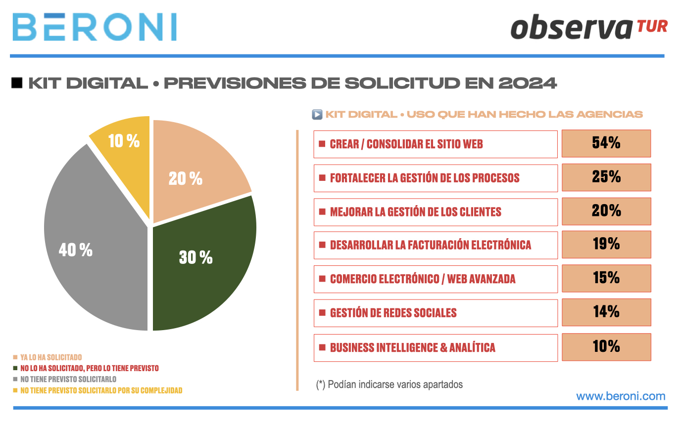 Según un estudio realizado por ObservaTUR para Beroni, empresa especializada en tecnología para el sector turístico, un 30 por ciento de las agencias de viajes nacionales tiene previsto acogerse este año al programa de ayudas a la digitalización financiado con los fondos NextGenerationEU, también conocido como Kit Digital, que permanece abierto hasta el 31 de diciembre de 2024 en todos sus segmentos y convocatorias activas.