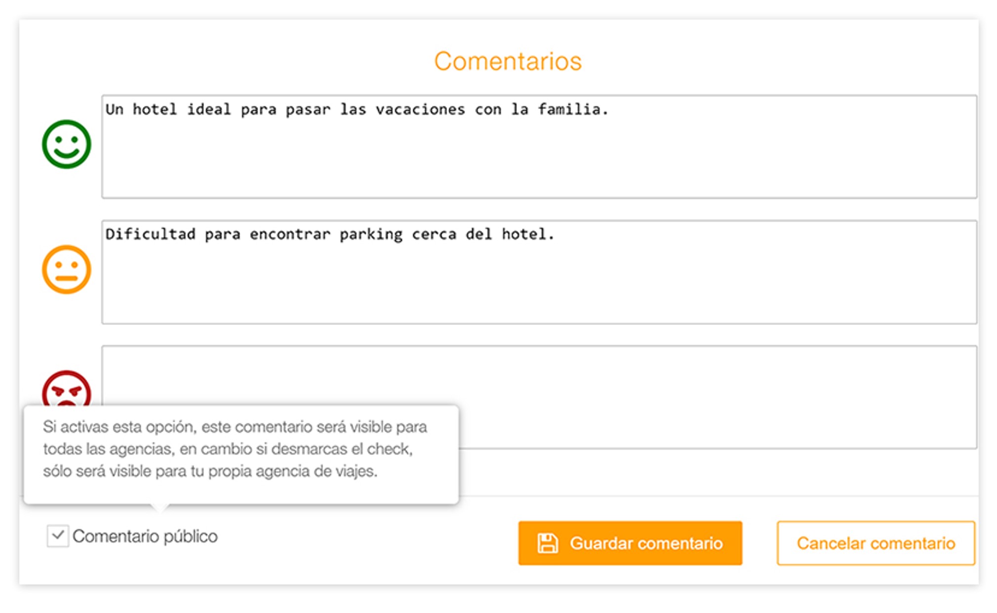 Introduce comentarios entre: Positivo – Correcto – Negativo: Por último, puedes dejar tus comentarios positivos, correctos y negativos para que otros agentes puedan saber más del hotel gracias a tu experiencia. No olvides marcar la opción de “Comentario público” para que todas las agencias puedan ver tu valoración.